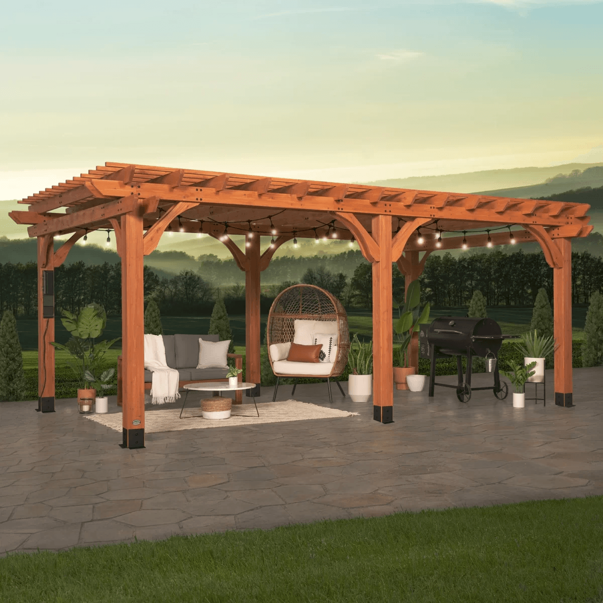 Transform your outdoor space with the Backyard Discovery 20′ x 12′ Beaumont Pergola, a stunning and durable structure designed to elevate your backyard. Crafted from 100% cedar wood, this pergola naturally resists decay while offering a timeless, traditional design with multi-level roof trellises and dual structural corbels for a touch of elegance.