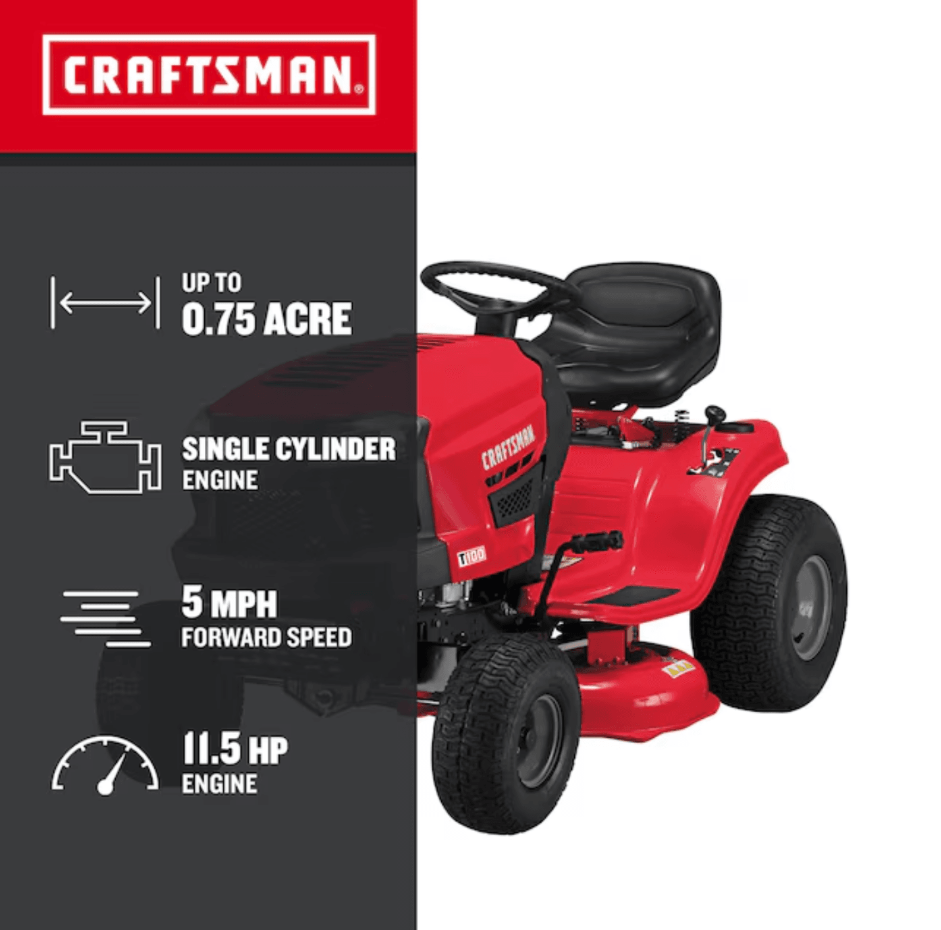 The CRAFTSMAN® T100 is built for homeowners seeking reliable performance, durability, and ease of use. Powered by a robust 11.5 HP Briggs & Stratton® single-cylinder engine, this front-engine riding mower is designed to handle tough jobs while offering a comfortable, easy-to-operate experience.