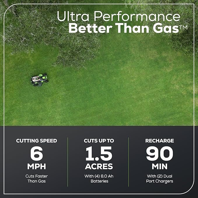 This model comes complete with four 8Ah batteries, providing ample power for extended mowing sessions. The battery configuration is optimized to maximize run time, so you can tackle large lawns without interruption.