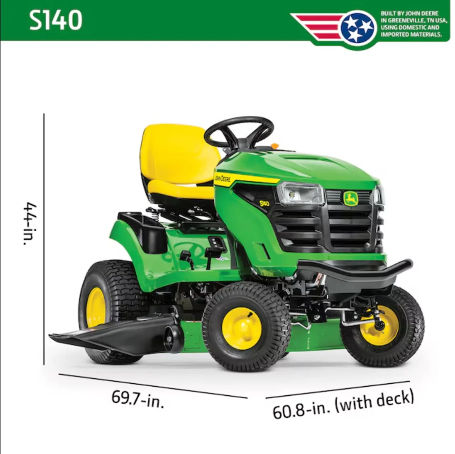 The John Deere S140 Riding Lawn Tractor is an ideal choice for homeowners seeking a powerful, comfortable, and long-lasting mower. Whether you’re mulching, mowing, or bagging, the S140 delivers superior results with the support and quality assurance you expect from John Deere.