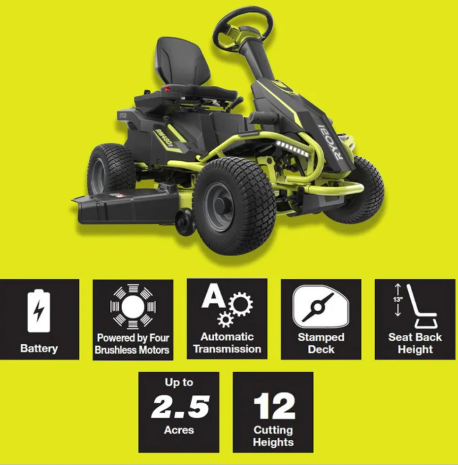 RYOBI 38″ 100 AH BATTERY ELECTRIC REAR ENGINE RIDING LAWN MOWER