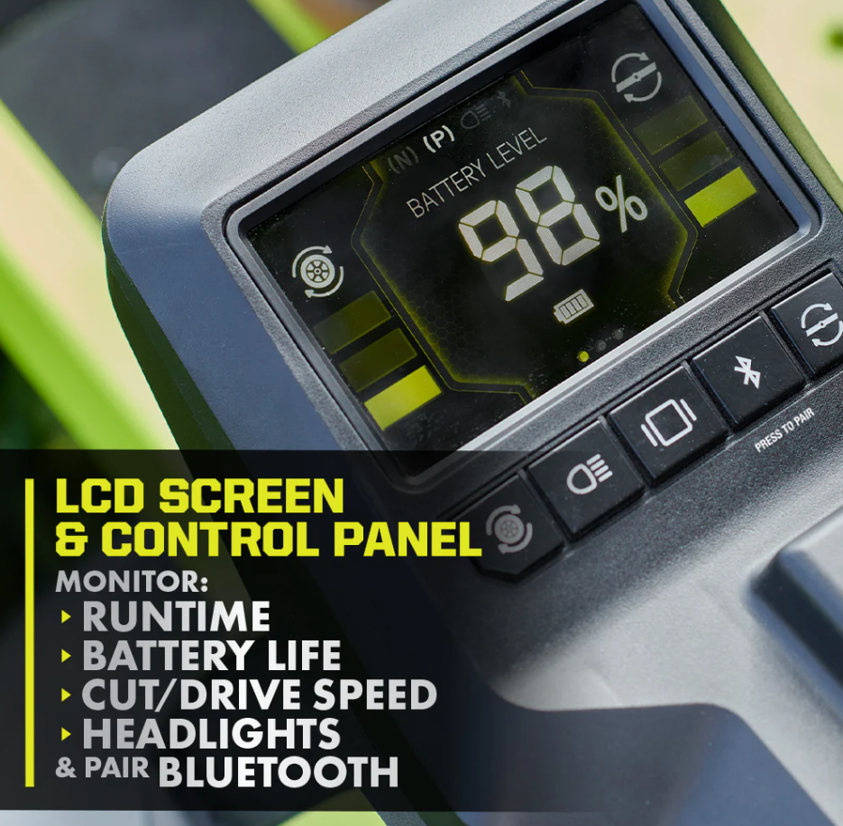 Introducing RYOBI’s first lithium-ion battery powered zero turn riding mower, the RYOBI 80V HP 54″ Lithium Electric ZTR*. HP Technology and 80V batteries combine to deliver the power equivalent of a 42 horsepower gas engine*, while eliminating the hassle and maintenance of a gas mower. This rider cuts up to 4 acres per charge with the help of 5 brushless motors, (3) 80V 10Ah batteries, and (4) 40V 12Ah batteries, with a Hyper Charger that fully recharges in 5 hours so you’re ready for your next job. The revolutionary iDrive system uses an intuitive one-handed joystick steering to maneuver around objects more easily than a traditional ZTR. The innovative LCD screen displays runtime, battery life, and cut/drive speed while in use, while the Riding Mower app allows you to monitor charge time and battery life remotely. This riding mower features the CROSS CUT multi blade system, providing superior cutting & mulching performance, while the 12-point height adjustment allows you to select the perfect cutting height between 1.5″ and 4.5″. The rubber side discharge chute makes it easy to maneuver around landscaping so users are not restricted by where they can cut. Designed with comfort and convenience in mind, this mower features premium seat suspension, 2 USB ports to charge phones, a storage compartment, and LED headlights. Mobile Service available in select regions. If your riding mower requires attention, a certified RYOBI support technician can diagnose & service right from your home. Some services may require you to bring your mower to one of the 300+ service centers nationwide. Lawn maintenance will never be the same thanks to the RYOBI 80V HP Brushless 54″ Lithium Electric Zero Turn Riding Mower.