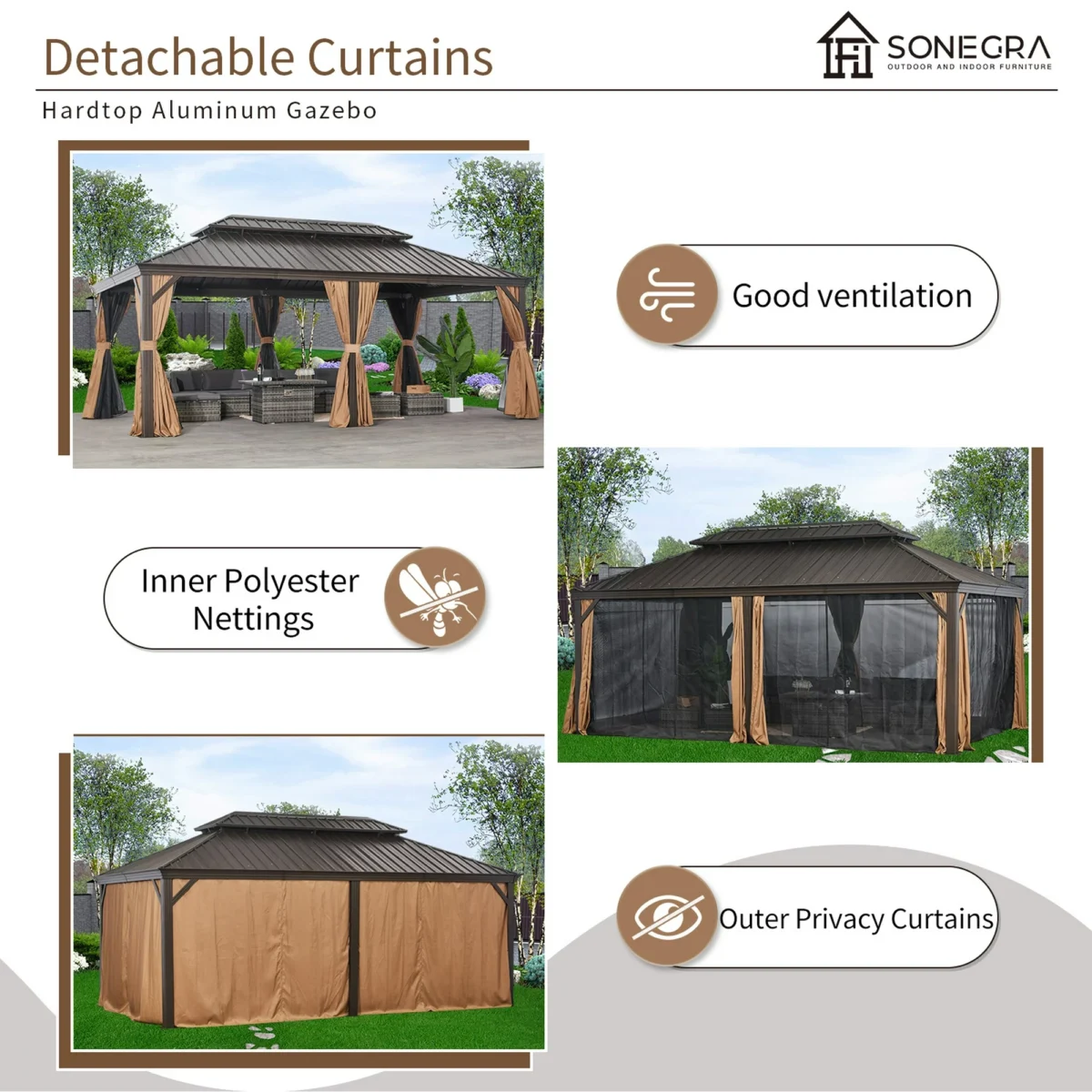 - Privacy Curtains & Mosquito Netting: Dual-layer system includes: